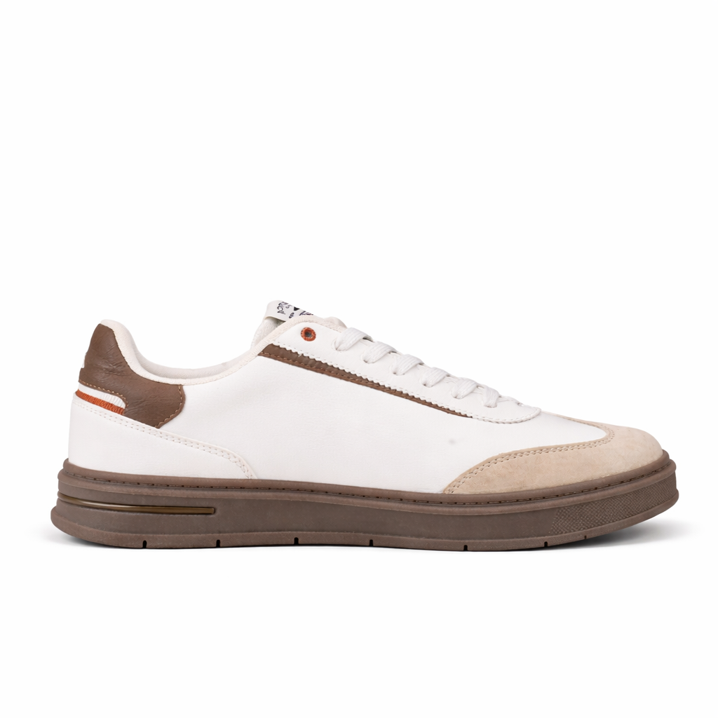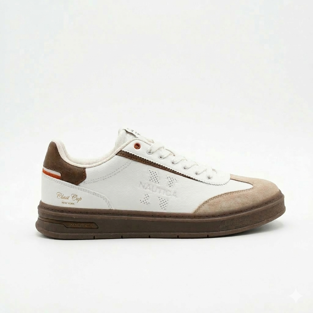 La tige en cuir blanc immaculé est rehaussée par des empiècements en suède beige sur l’avant et des touches de cuir marron café au talon. Le logo Nautica est délicatement perforé sur le côté, assurant une respirabilité optimale tout en affirmant l’identité de la marque. Avec sa semelle contrastée marron, cette basket offre un équilibre parfait entre tradition et modernité.