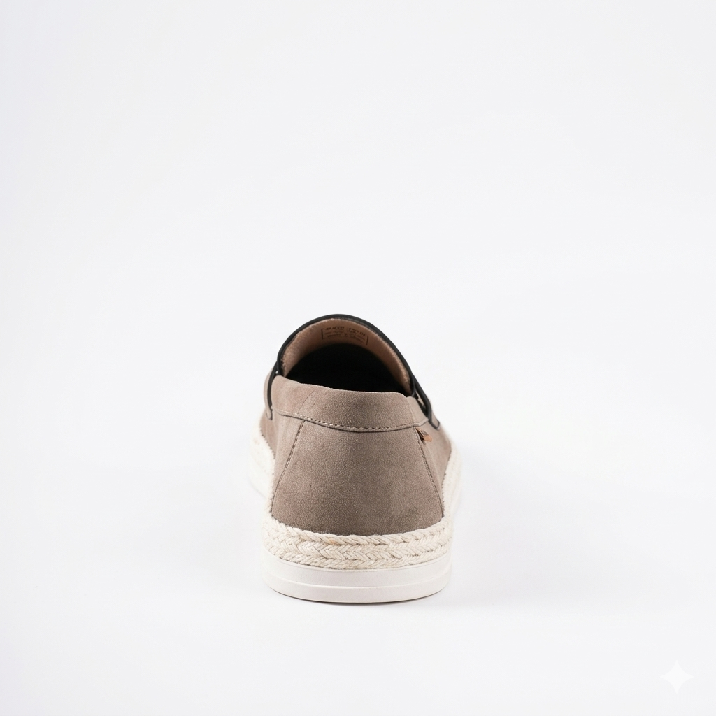 Conçues en nubuck (ou suède) taupe d’une grande douceur, ces chaussures arborent une bride classique sur le cou-de-pied. La véritable originalité réside dans sa semelle : une bordure en corde tressée artisanale surmontant une semelle extérieure blanche crantée, offrant à la fois un style estival et un confort de marche moderne et urbain.