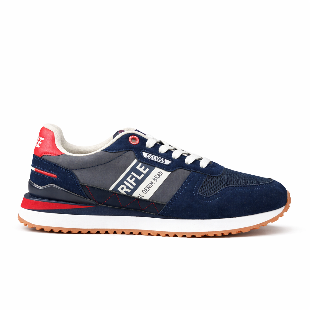 Adoptez un style moderne et confortable avec ces sneakers RIFLE pour homme. Conçues avec un design sportif et élégant, elles combinent parfaitement des couleurs bleu marine, gris et rouge pour un look tendance et dynamique.